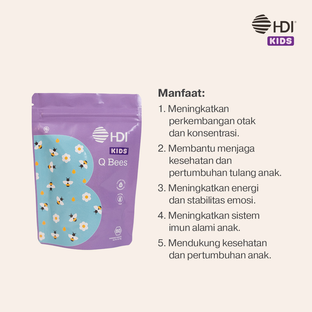 Anak-Anak jadi lebih pintar dan ceria dengan Q Bees, tablet kunyah rasa madu dengan bahan aktif alami, siap mendukung pertumbuhan dan perkembangan otak buah hati.